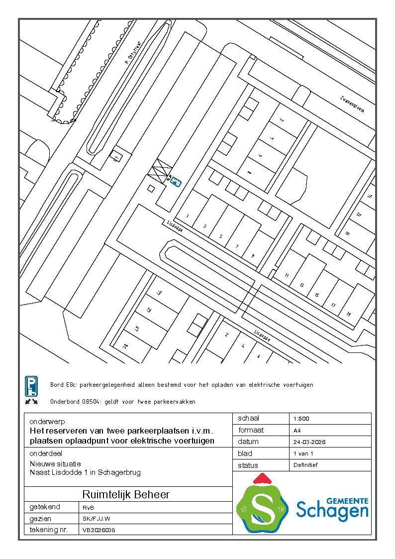 Gemeente Schagen- Verkeersbesluit reserveren van 2 parkeerplaatsen voor het opladen van elektrische voertuigen nabij Lisdodde 1, Schagerbrug.