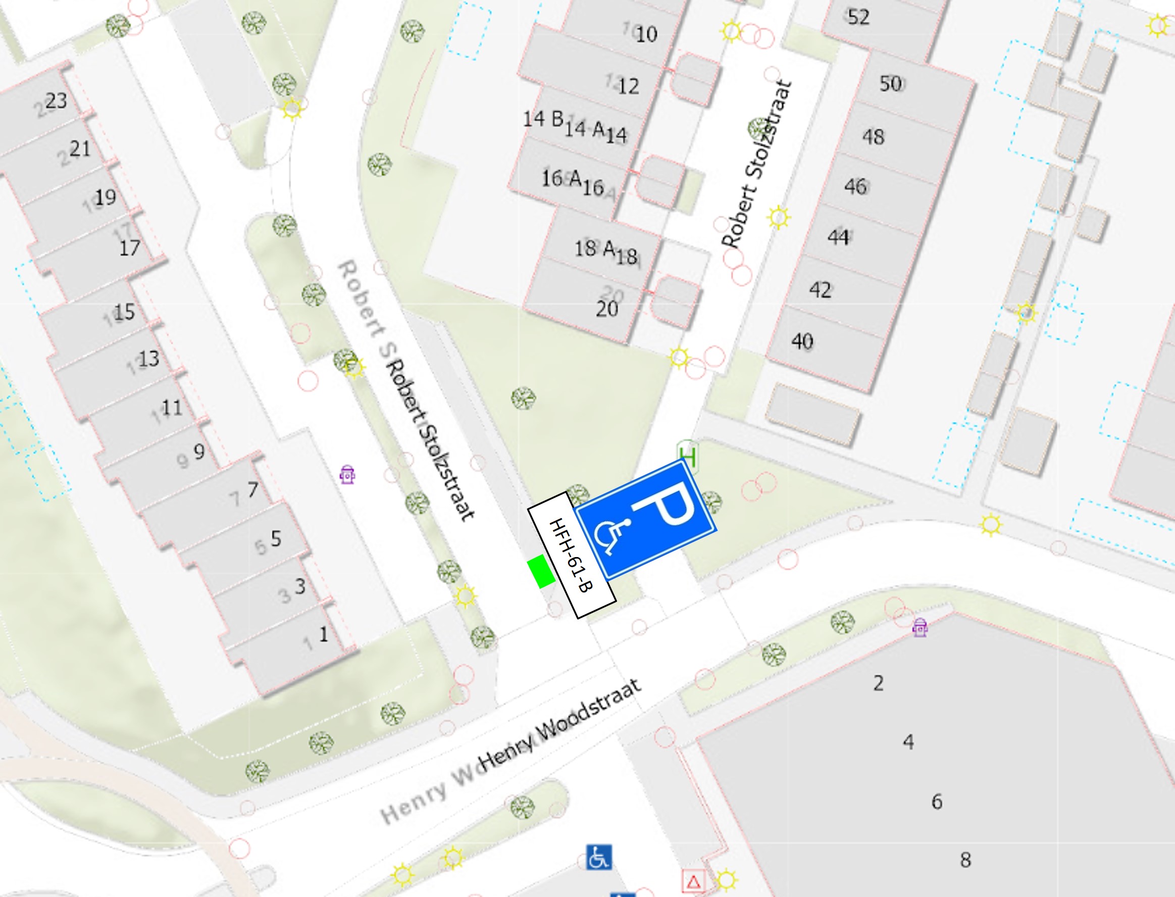 We wijzen aan de Robert Stolzstraat een gehandicaptenparkeerplaats toe voor het voertuig met kenteken HFH-61-B. Deze plek maken we herkenbaar met verkeersbord E6 (RVV 1990) en een onderbord met het kenteken. De exacte locatie staat op de tekening die bij dit besluit hoort.