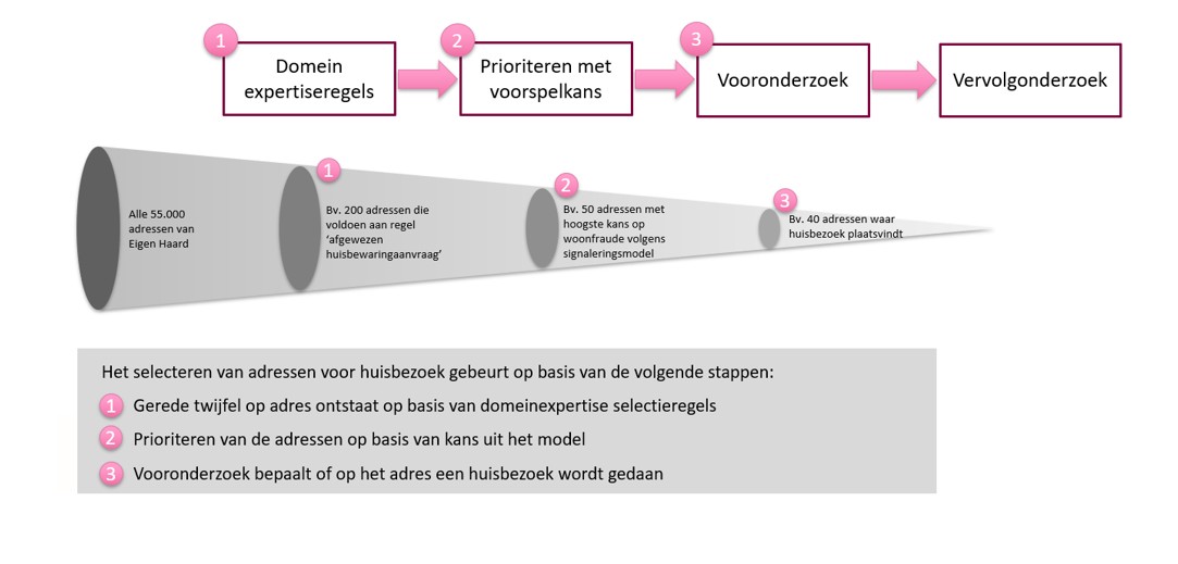 De output van het signaleringsmodel zijn geprioriteerde meldingen (gerede twijfel, lage twijfel). Er vindt geen geautomatiseerde besluitvorming plaats. Op basis van deze ordening start Eigen Haard onderzoek en voert een huisbezoek uit. Een medewerker van Eigen Haard neemt op basis van de verzamelde bewijsstukken een besluit over ontbinding en/of gele kaart. De stappen om te komen tot dossiers waar verder onderzoek moet plaatsvinden, is schematisch weergegeven in bijlage 3.5E.
