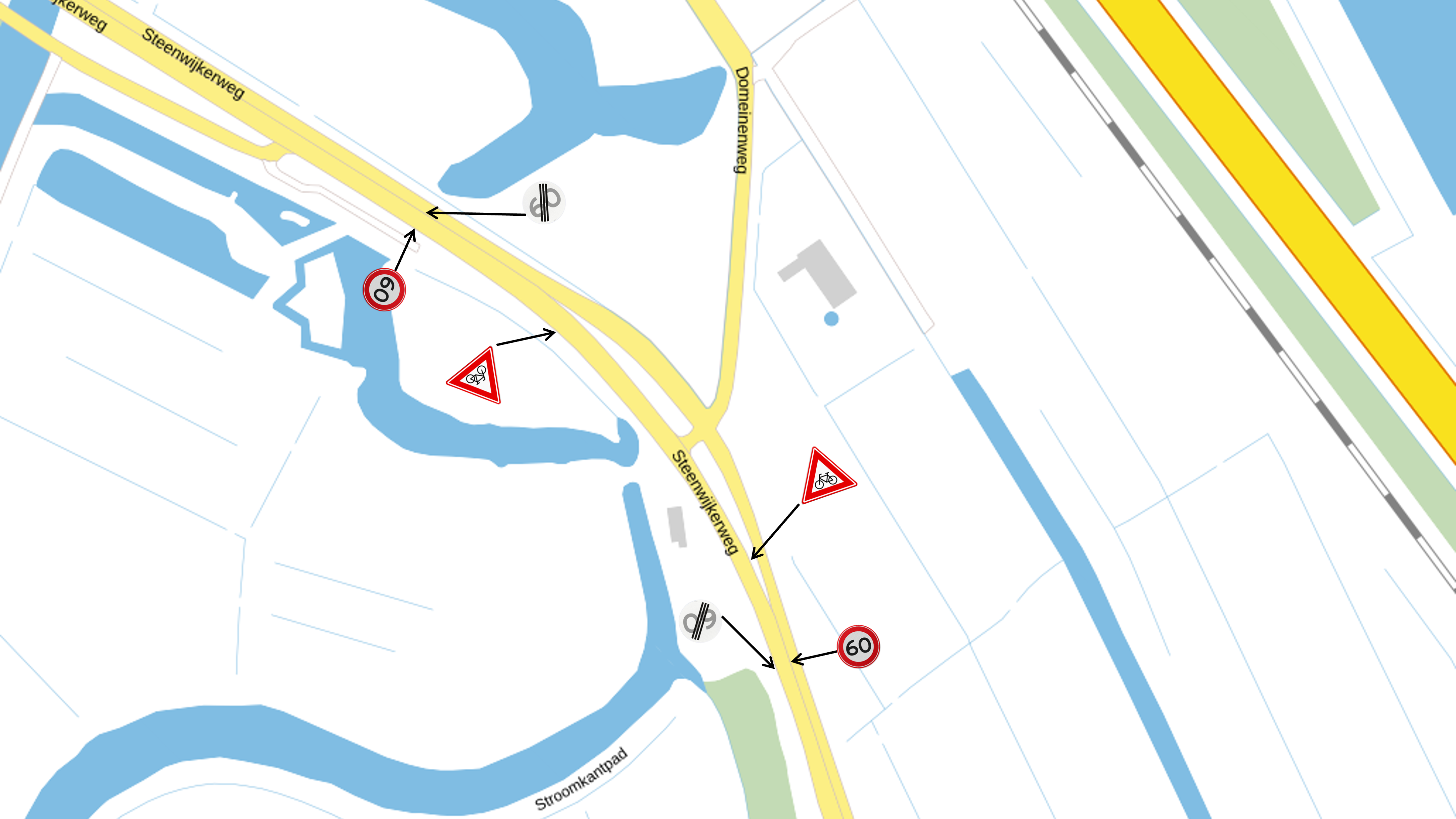 Daarnaast wordt de maximumsnelheid ter plaatse over een traject van circa 500 meter verlaagd van 80 naar 60 km/uur. Dit wordt gerealiseerd door het plaatsen van borden A1 (60 km/uur), A2 (einde 60 km/uur) en J24 (overstekende fietsers) zoals in bijlage 1 van het Reglement verkeersregels en verkeerstekens 1990. Ook wordt er een 60-km-markering op het wegdek aan twee kanten aangebracht bij de entree van het traject.