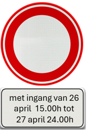 Vaststellen: Geslotenverklaring in beide richtingen voor voertuigen, ruiters en geleiders van rij- of trekdieren of vee (C1) zone met het onderbord “Met ingang van 26 april 15:00h tot 27 april 24:00h