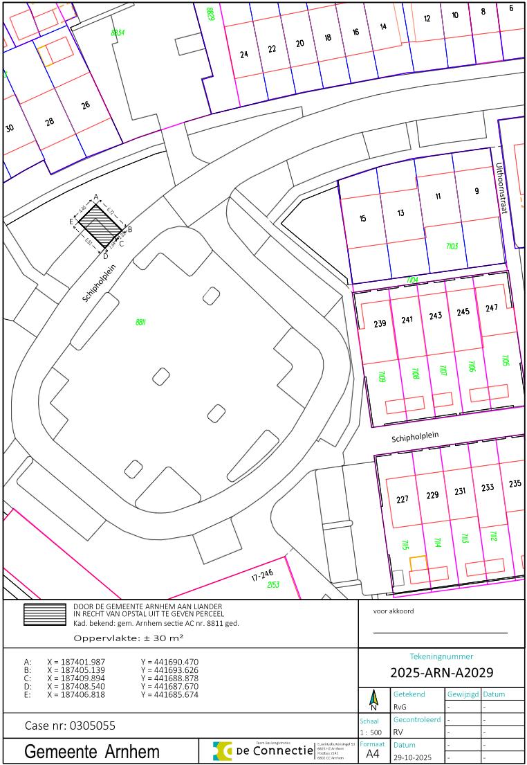 Liander N.V. is voornemens om tegenover Schipholplein 28, kadastraal bekend gemeente Arnhem, sectie AC nummer 8811 (gedeeltelijk perceel), een middenspanningsruimte (hierna: MSR) te realiseren ten behoeve van de stroomvoorziening van het omliggende gebied. De MSR dient te worden gerealiseerd op een gedeelte van de locatie zoals aangegeven op bijgaande tekening met nummer 2025-ARN-A2029. Liander heeft om deze reden verzocht tot vestiging van een opstalrecht op deze locatie (circa 30 m2) ten behoeve van Liander.