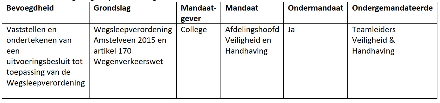 Bij hoofdstuk 5 OVERZICHT EXTERNE MANDATEN AMSTELVEEN, WEGENVERKEERSWET 1994/WEGSLEEPVERORDENING AMSTELVEEN 2015