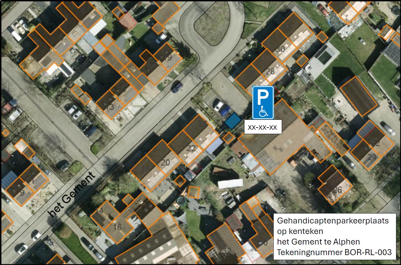 Burgemeester en wethouders van gemeente West Maas en Waal besluiten parkeren te verbieden op een parkeerplaats in de straat het Gement te Alphen, naast huisnummer 24. Dit geldt niet voor het voertuig waarvan het kenteken op het onderbord vermeld staat. Dit staat aangegeven op tekening BOR-RL-003.