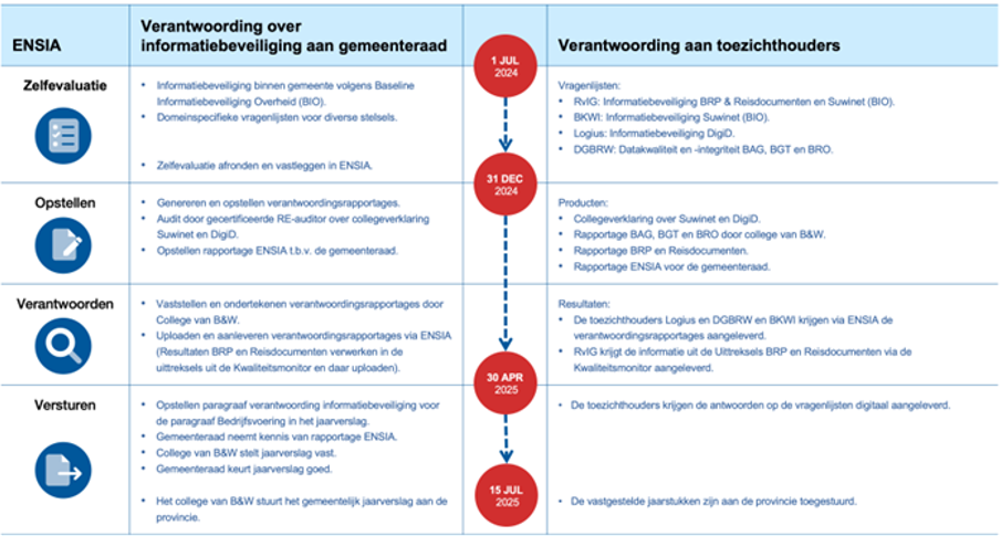 De gemeente verantwoordt zich over informatiebeveiliging middels de ENSIA-systematiek. Dat betekent dat een ENSIA-coördinator wordt aangewezen. Deze zorgt ervoor dat de informatie die nodig is voor het beantwoorden van vragen binnen ENSIA wordt opgehaald bij de verantwoordelijke afdelingsmanagers. De afdelingsmanagers leveren alle informatie die nodig is voor het invullen van de jaarlijkse ENSIA-vragenlijsten.