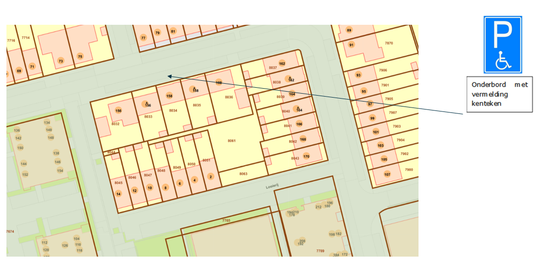 dat de aanvager beschikt over een eigen parkeerplek (gelegen aan de achterzijde van de woning; aan de zijde van de Looijerij), maar dat deze parkeerplaats niet voldoet aan de afmetingen welke geadviseerd wordt bij een haakse gereserveerde gehandicaptenparkeerplaats;