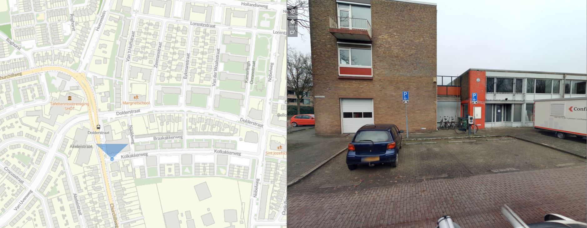 In de afbeelding hierboven staat links met een blauwe driehoek aangegeven waar de laadpaal zou gaan komen komen. Rechts kunt u zien welke vier parkeervakken momenteel gereserveerd zijn. Dit besluit wordt aangepast waardoor enkel de twee vakken aan de rechter kant nog gereserveerd zullen zijn. Dit betekent dat de linker borden verwijderd zullen worden en deze parkeerplaatsen weer opengesteld worden.