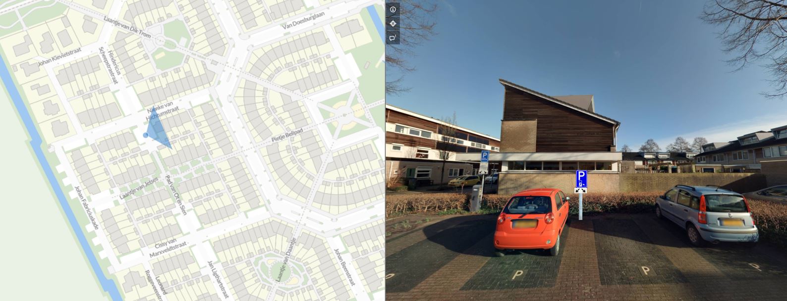 In de afbeelding hierboven staat links met een blauwe driehoek aangegeven waar de laadpaal gaat komen. Rechts kunt u zien welke twee extra parkeervakken gereserveerd worden. Dit is dus als aanvulling op de twee bestaande plaatsen.