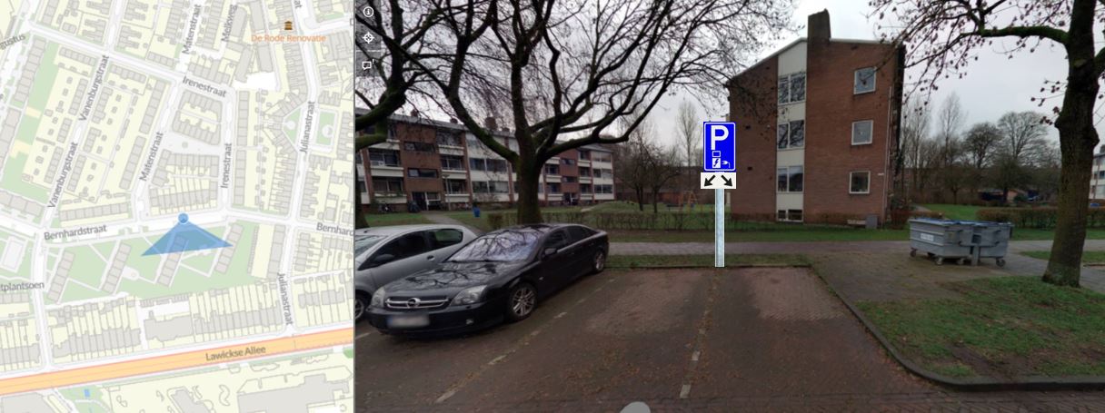 In de afbeelding hierboven staat links met een blauwe driehoek aangegeven waar de laadpaal gaat komen. Rechts kunt u zien welke twee extra parkeervakken gereserveerd worden.
