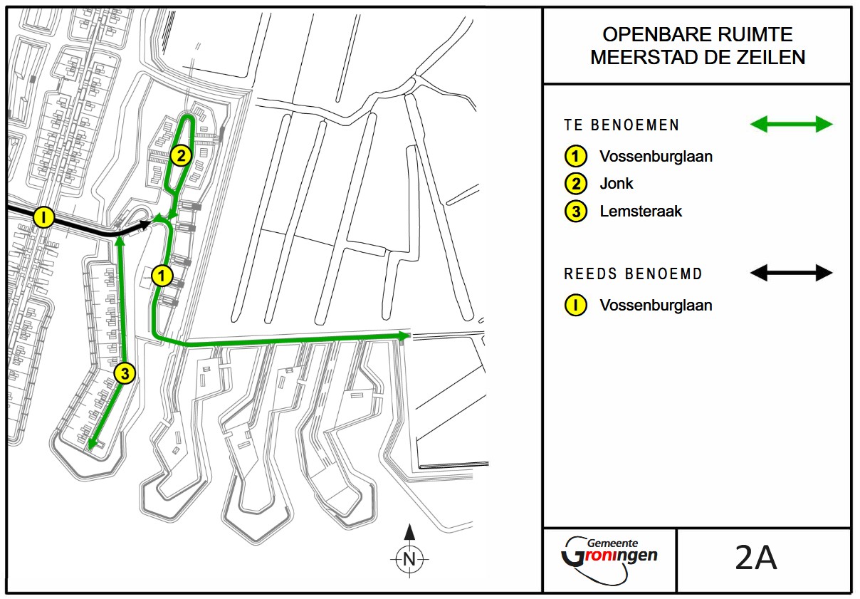 in de openbare ruimte van de buurt De Zeilen in de woonplaats Meerstad van het type weg te benoemen: Vossenburglaan, Jonk en Lemsteraak, overeenkomstig bijlage 2a;