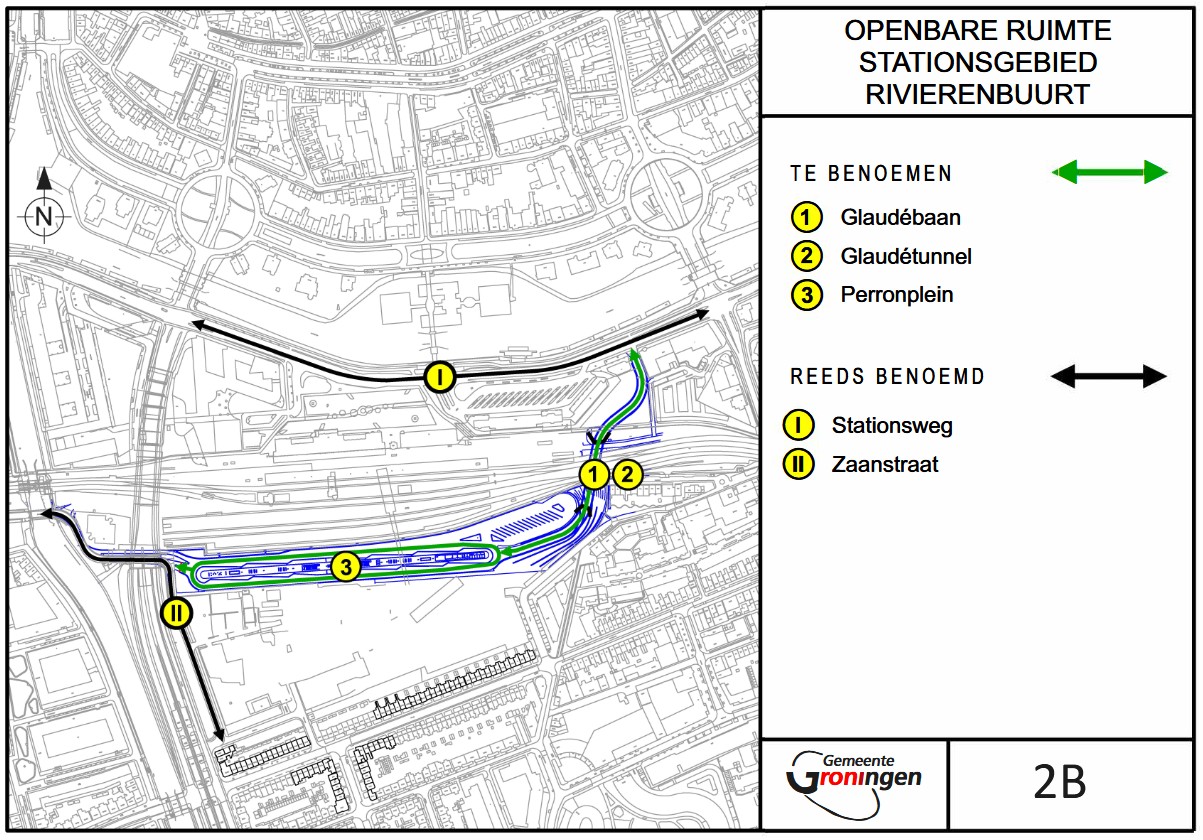 in de openbare ruimte van de buurten Stationsgebied en Rivierenbuurt in de woonplaats Groningen van het type weg te benoemen: Glaudébaan, Glaudétunnel en Perronplein, overeenkomstig bijlage 2b;