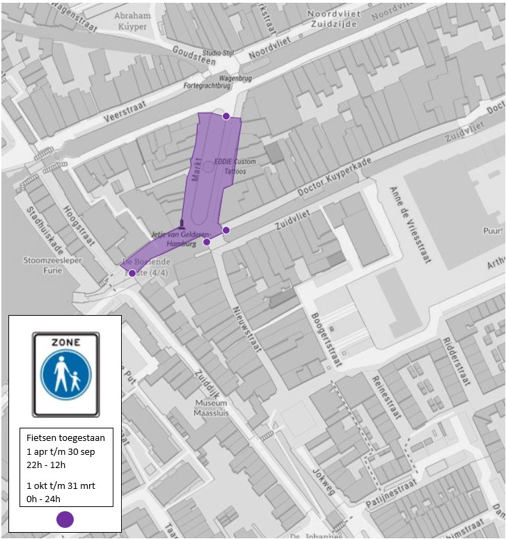 Het aanpassen van de datums en tijdstippen waarop fietsers worden toegestaan in de voetgangerszone Wip en Markt naar 1 apr t/m 30 sep 22h - 12h en 1 okt t/m 31 mrt 0h - 24h door middel van het toepassen van onderborden onder reeds aanwezige borden G07 ‘Voetpad’ conform bijlage 1 van het RVV 1990 in de zone-uitvoering, zoals aangegeven in de bij dit besluit behorende bijlage;