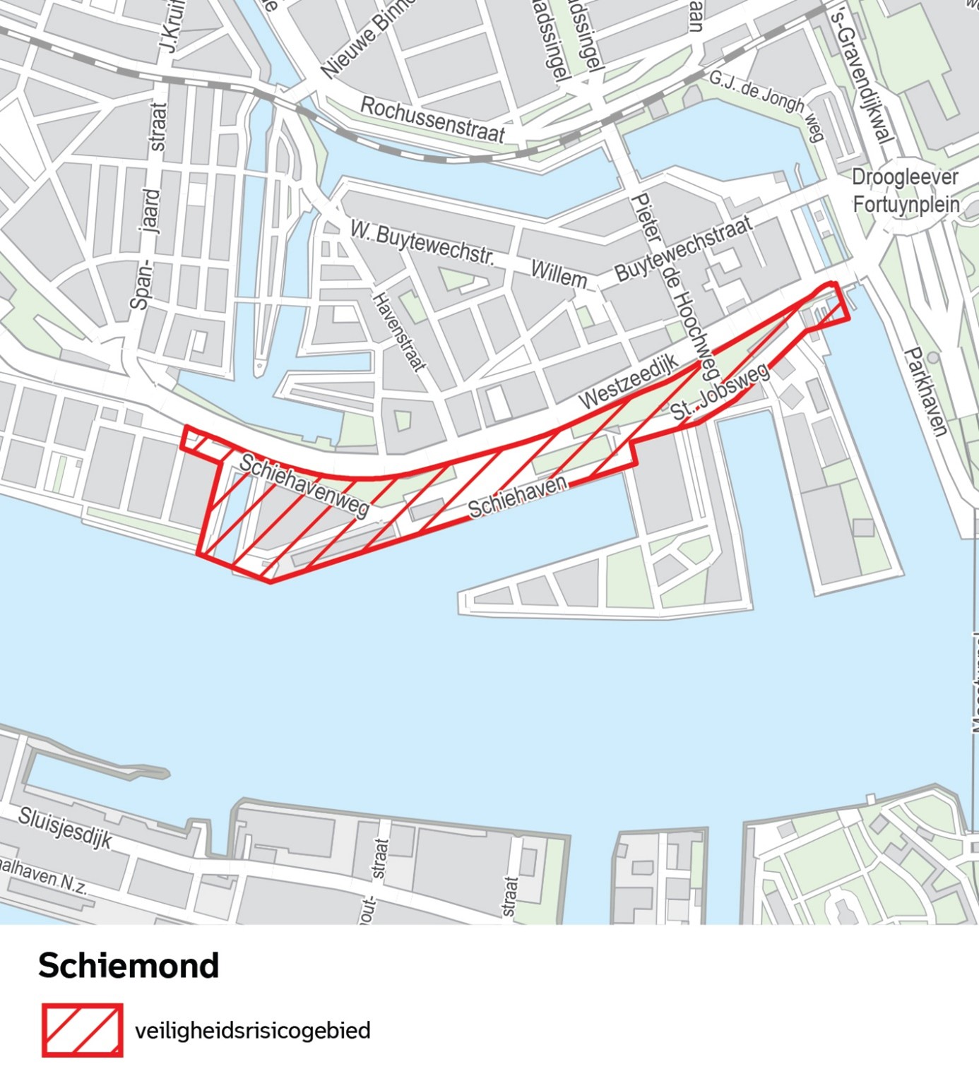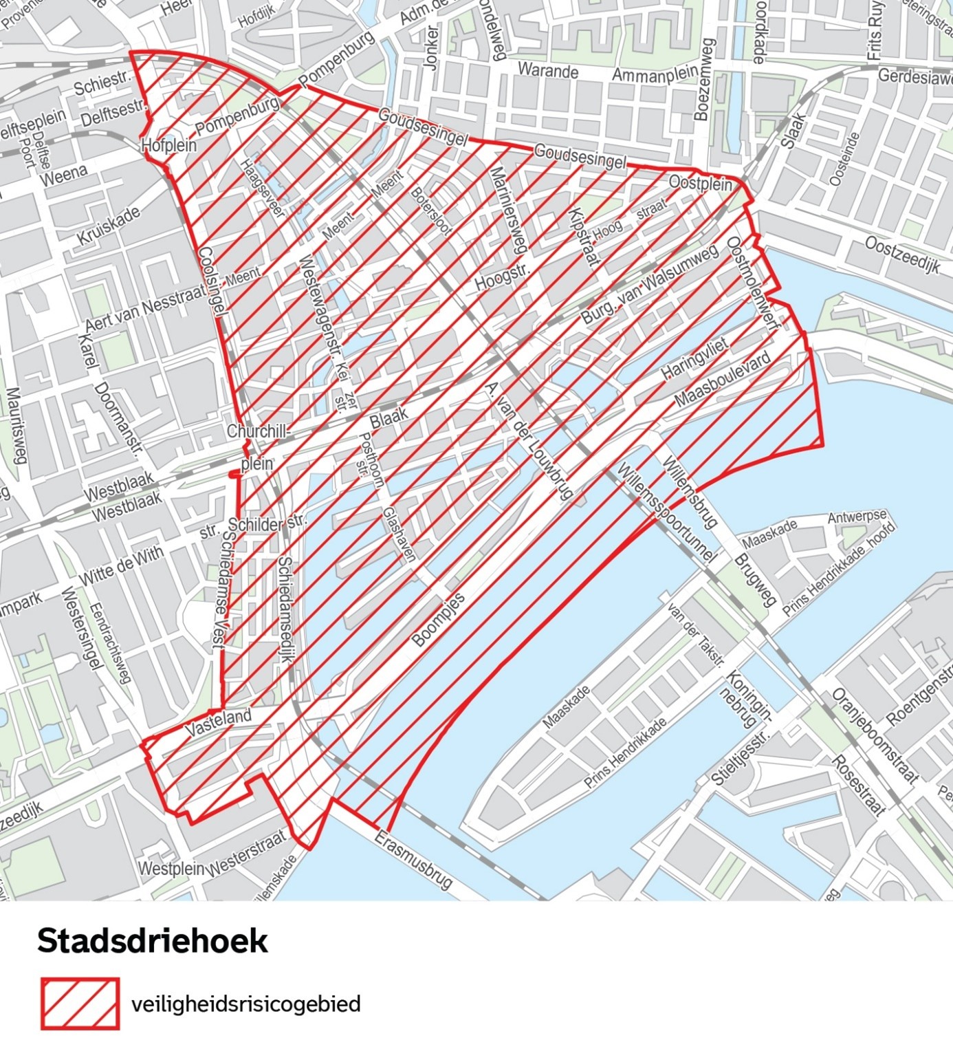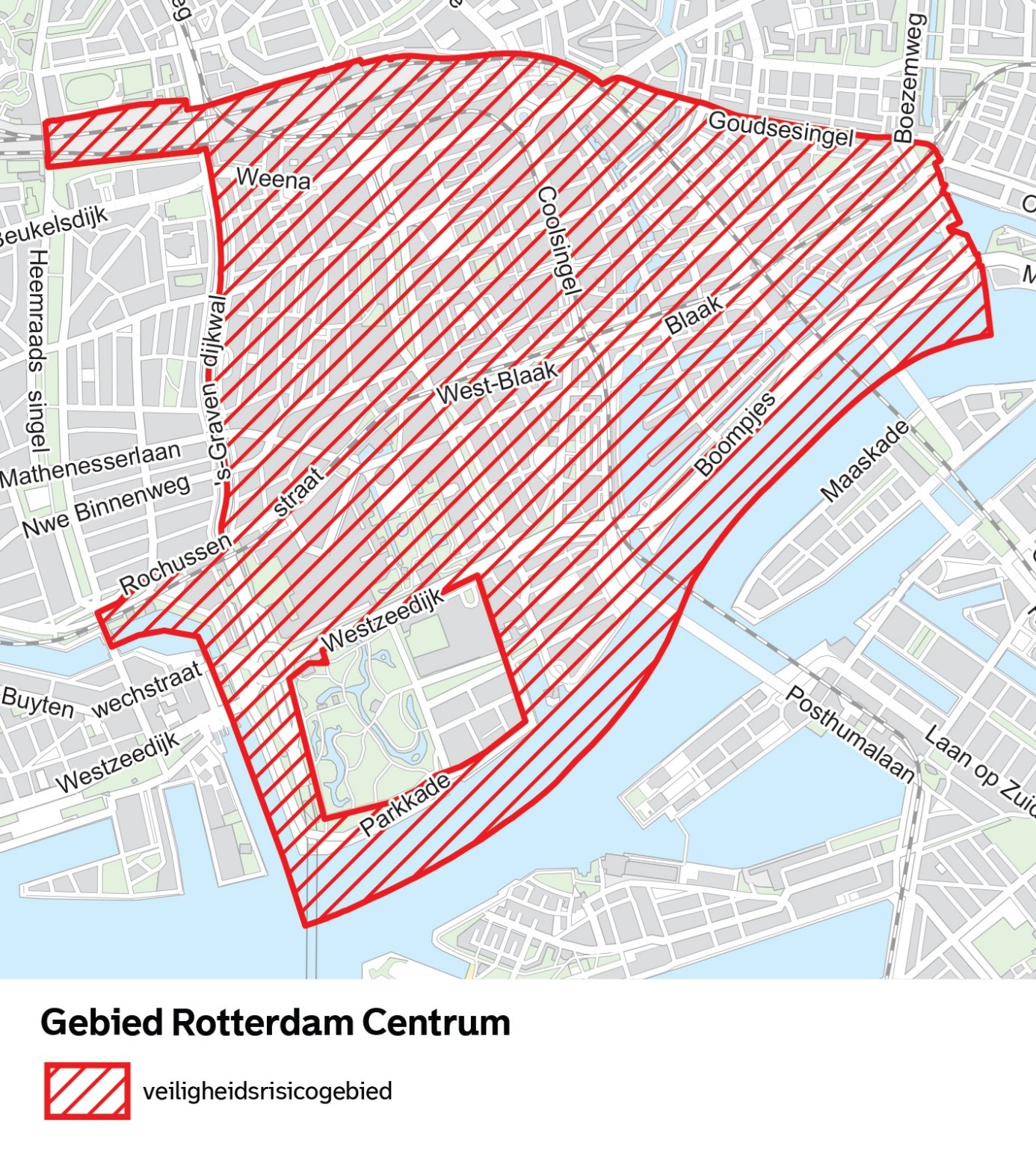 Op grond van artikel 2:76 van de Algemene plaatselijke verordening Rotterdam 2012 wordt het gebied Centrum, zoals aangegeven op de kaarten in bijlage 1, met inbegrip van de daarin gelegen voor het publiek openstaande gebouwen en daarbij behorende erven, wegen, oevers en aanwezige knooppunten van het openbaar vervoer, aangewezen als veiligheidsrisicogebied.