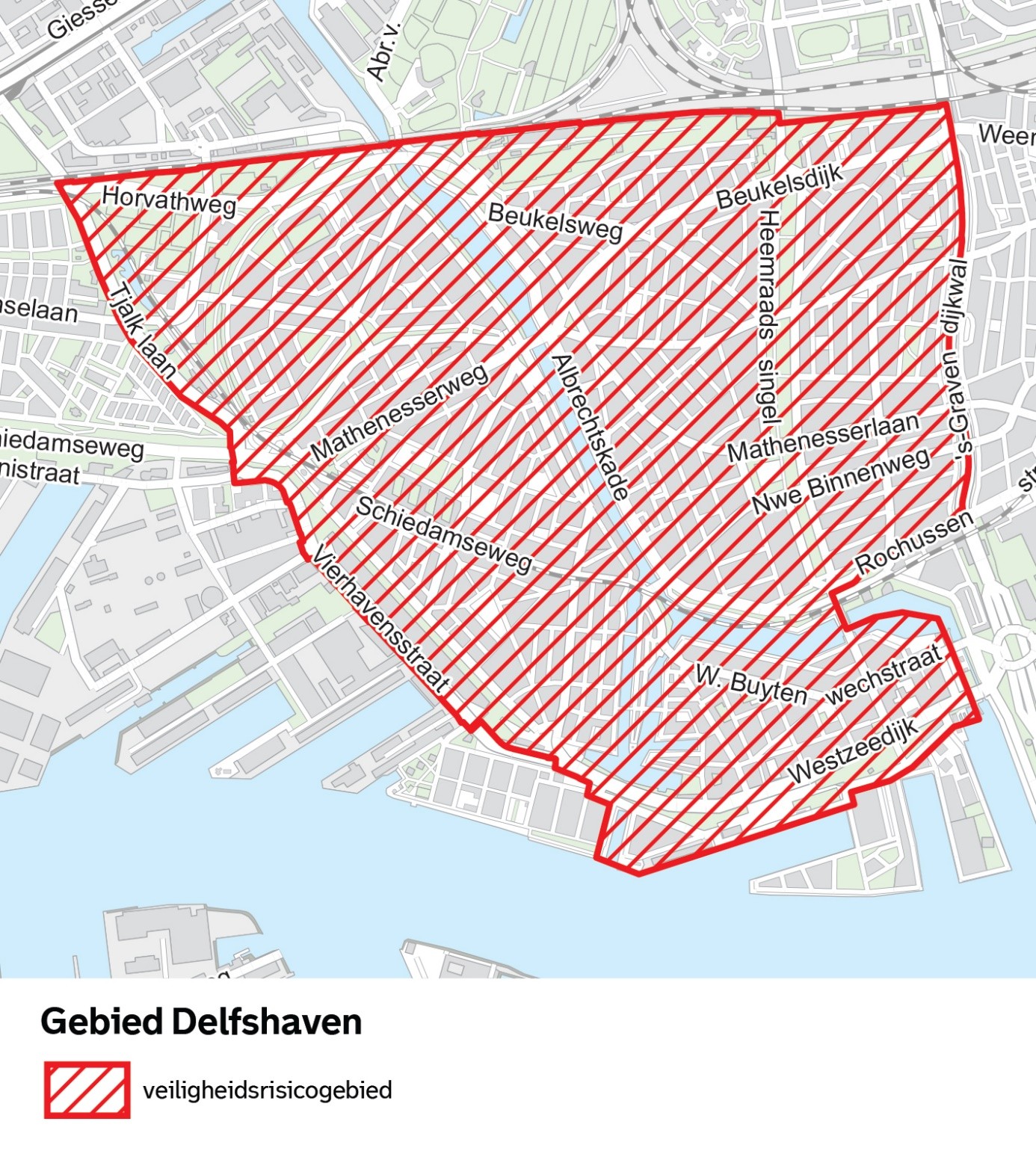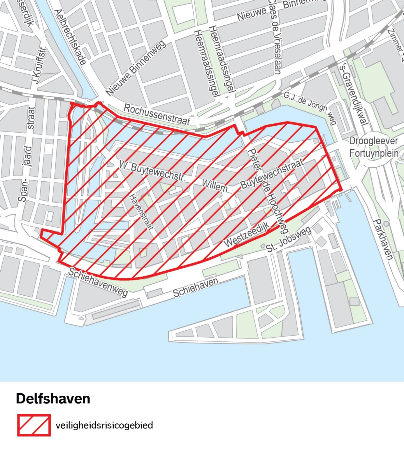 Op grond van artikel 2:76 van de Algemene plaatselijke verordening Rotterdam 2012 wordt het gebied Delfshaven, zoals aangegeven op de kaarten in bijlage 2, met inbegrip van de daarin gelegen voor het publiek openstaande gebouwen en daarbij behorende erven, wegen, oevers en aanwezige knooppunten van het openbaar vervoer, aangewezen als veiligheidsrisicogebied.