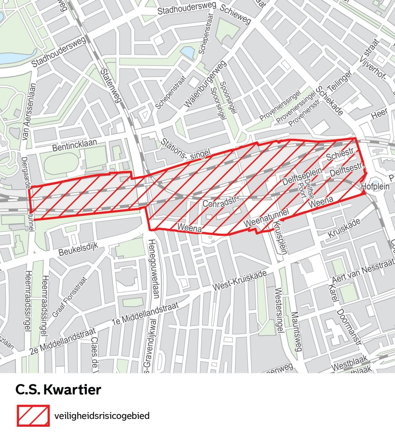 Het veiligheidsrisicogebied Centrum, zoals aangegeven op de kaarten in bijlage 1, omvat de CBS wijken Oude Westen, Cool, Dijkzigt, Nieuwe Werk (uitgezonderd het gebied Het Park en het gebied binnen de straten Baden Powellaan, Heuvellaan, Westerkade, Veerhaven, Westmaaslaan, Westzeedijk tot aan de Baden Powellaan), Stadsdriehoek en C.S.-Kwartier, begrensd door de Parkhaven (water) en de straten ’s-Gravendijkwal, Henegouwerlaan, Weena, Conradstraat, Centraal Station Rotterdam, Delftseplein, Schiestraat, Schiekade, Couwenburg, Pompenburg, Goudsesingel, Oostplein, Oosterkade, Nieuwe Maas (water) en Parkhaven (water), de genoemde wegen, alle OV-knooppunten en locaties daaronder begrepen;