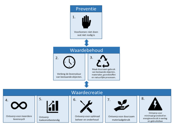 De acht werkprincipes zijn met opzet in een piramidevorm weergegeven. Hiermee maken we onderscheid tussen drie ‘lagen’. Onder de lagen hangen de acht werkprincipes. De bovenste ‘laag’ (preventie) is de meest circulaire ‘laag’ met de meeste impact. Daarna volgt waardebehoud en hierna waardecreatie.