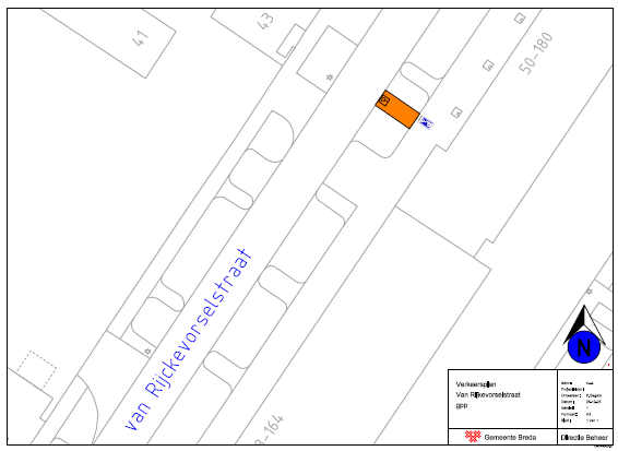 Een gehandicaptenparkeerplaats op kenteken aan te wijzen in de Van Rijckevorselstraat ter hoogte van huisnummers 50 t/m 180 te Breda. Een en ander zoals weergegeven op de bijgevoegde tekening ‘Verkeersplan Van Rijckevorselstraat gpp’.