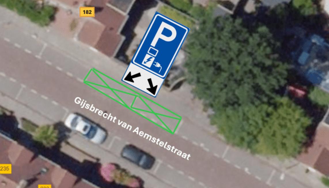 door middel van het plaatsen van het verkeersbord conform model E8c van bijlage 1 van het RVV 1990 met een onderbord OB504 met pijlen, waaruit blijkt dat het bord voor twee parkeerplaatsen van toepassing is – in de Gijsbrecht van Aemstelstraat nabij no.182, een tweetal parkeerplaatsen te reserveren die alleen bestemd zijn voor het opladen van elektrische voertuigen.