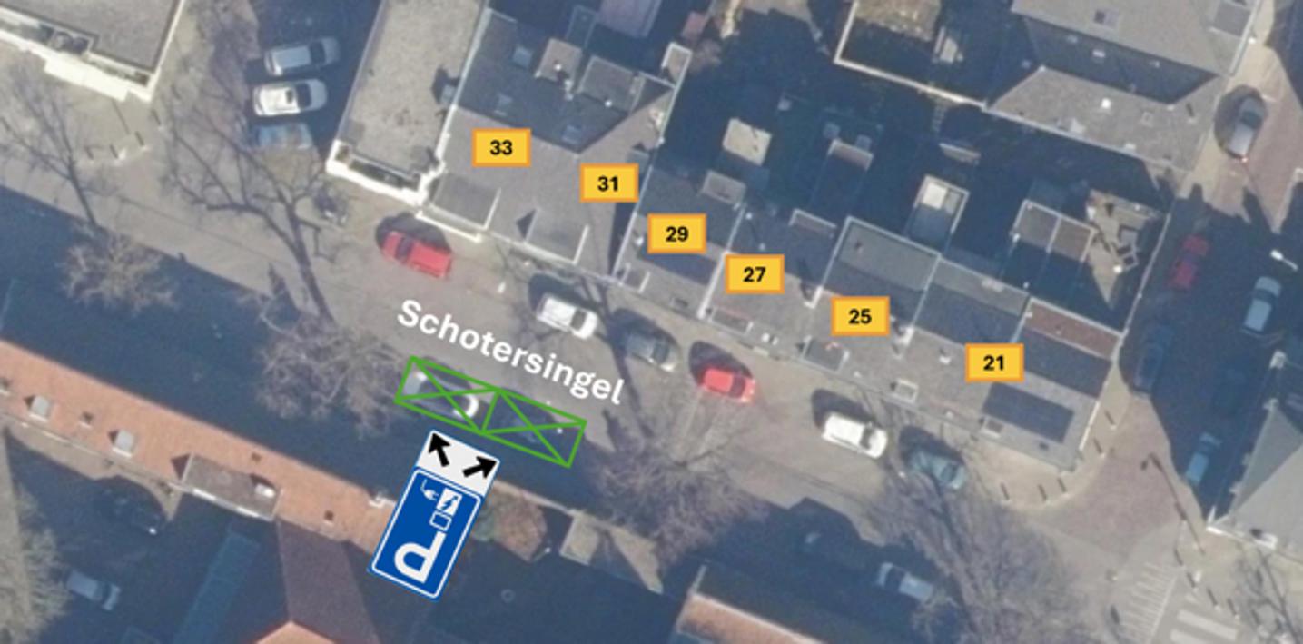door middel van het plaatsen van het verkeersbord conform model E8c van bijlage 1 van het RVV 1990 met een onderbord OB504 met pijlen, waaruit blijkt dat het bord voor twee parkeerplaatsen van toepassing is – in de Schotersingel nabij no.31, een tweetal parkeerplaatsen te reserveren die alleen bestemd zijn voor het opladen van elektrische voertuigen.