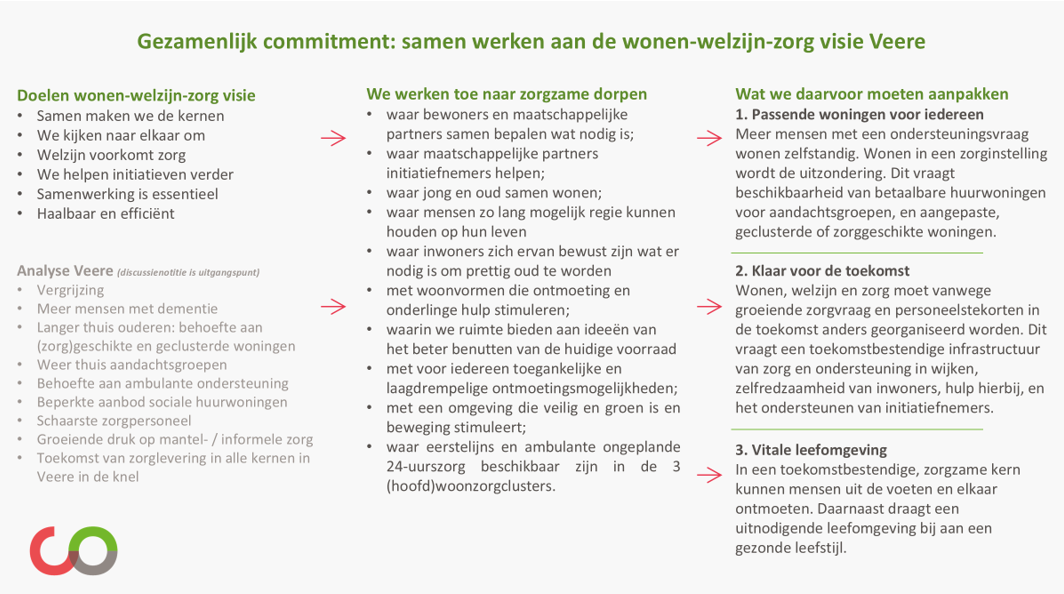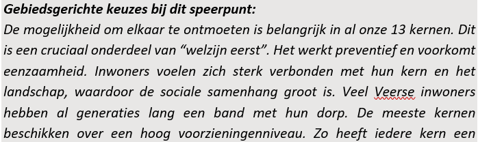 “Onze kernen zijn plekken die uitnodigen om te bewegen, te ontspannen en elkaar te ontmoeten. Voorzieningen zijn beschikbaar en toegankelijk. Het landelijk wonen, het dorpsgevoel en de groene omgeving met de zee nabij zijn kenmerkend voor Veere. De kwaliteiten voor een vitale leefomgeving zijn dus al aanwezig. We willen deze kwaliteiten versterken en benutten zodat onze inwoners gezond en prettig oud kunnen worden in Veere.
