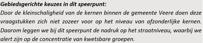 Daarnaast is het belangrijk dat inwoners op een laagdrempelige en gemakkelijke manier vragen kunnen stellen en begeleid worden naar de juiste persoon of voorziening. Dit is ook één van de doelen uit het preventiebeleid. Zichtbaarheid en gezamenlijke aanwezigheid van zorg- en welzijnsorganisaties is daarbij belangrijk. Dit betekent niet dat elke aanbieder fysiek in iedere kern aanwezig moet zijn, maar wel dat er duidelijke afspraken zijn over wie wanneer vindbaar is, op welke plek en hoe een warme overdracht tussen partijen plaatsvindt. De invulling hiervan verschilt per kern. In de hoofdkernen kan worden aangehaakt bij het bestaande sociale netwerk, waardoor professionals makkelijker zichtbaar en bereikbaar zijn. In kleinere kernen vraagt dit soms extra inzet van organisaties om aanwezig te zijn op logische, vertrouwde plekken voor inwoners. De gemeente Veere speelt hierin een verbindende en ondersteunende rol.