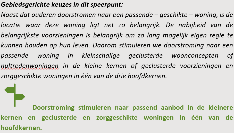 De meeste ouderen blijven wonen op de plek waar ze hun kinderen hebben zien opgroeien. Toch is het wenselijk dat een deel van de ouderen op tijd kan doorstromen naar een passende woning, zodat zij comfortabel en veilig kunnen blijven wonen. Ook als zij bijvoorbeeld minder goed ter been mochten worden of behoefte hebben aan een woonconcept waar ze met gelijkgestemden kunnen samenleven. Tegelijkertijd is het ook wenselijk dat ouderen hun sociale netwerk in hun vertrouwde omgeving zoveel mogelijk behouden. Dit netwerk biedt niet alleen emotionele steun, maar draagt ook bij aan hun welzijn en zelfstandigheid. Door diversiteit in het woningaanbod in iedere kern te stimuleren, kunnen ouderen blijven terugvallen op voor hen bekende mensen en voorzieningen in hun eigen buurt. Tegelijkertijd voorkomt een goede doorstroming dat jongere generaties worden belemmerd in hun zoektocht naar een geschikte woning.