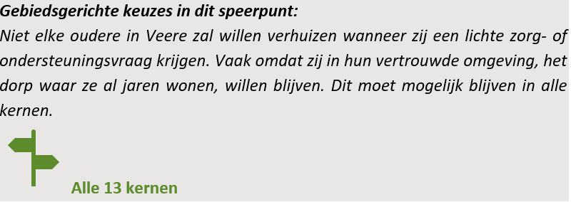 • Het huidige aanbod aan verpleeghuiszorg wordt zoveel mogelijk in stand gehouden: in alle hoofdkernen én in enkele kleinere kernen waar nu al verpleeghuiszorg aanwezig is.