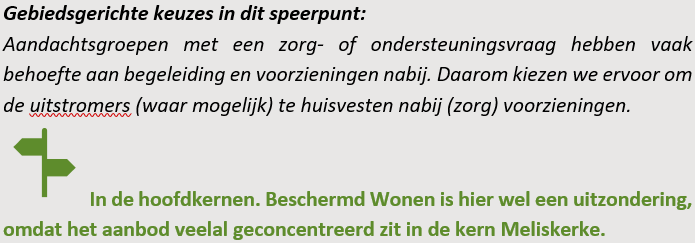 • Nieuwe of extra zorggeschikte woningen worden in principe alleen in de hoofdkernen ontwikkeld (zie verdere uitwerking in paragraaf 4.1). Kleinschalige, geclusterde complexen kunnen naar behoefte worden toegevoegd in iedere kern.