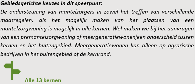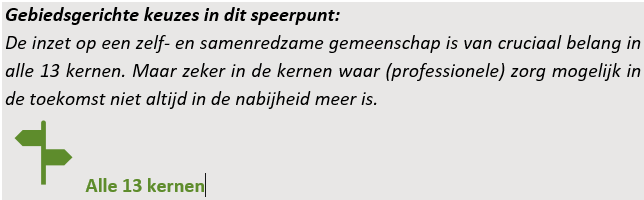 • De kleinschaligheid van de 13 kernen is een belangrijke kwaliteit en vormt het vertrekpunt bij het ontwikkelen van nieuwe woonzorgconcepten.