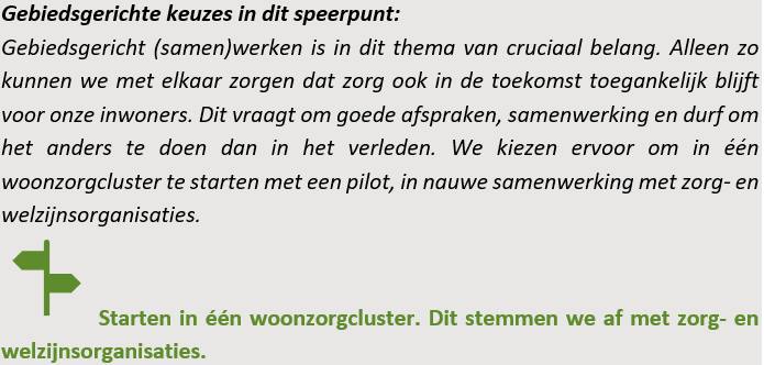 2. We wijzen ‘woonzorgclusters’ aan in onze gemeente. Daar landt de belangrijkste opgave voor ouderenhuisvesting in de gemeente (zowel in nieuwbouw, als een inventarisatie over mogelijkheden in bestaande voorraad).