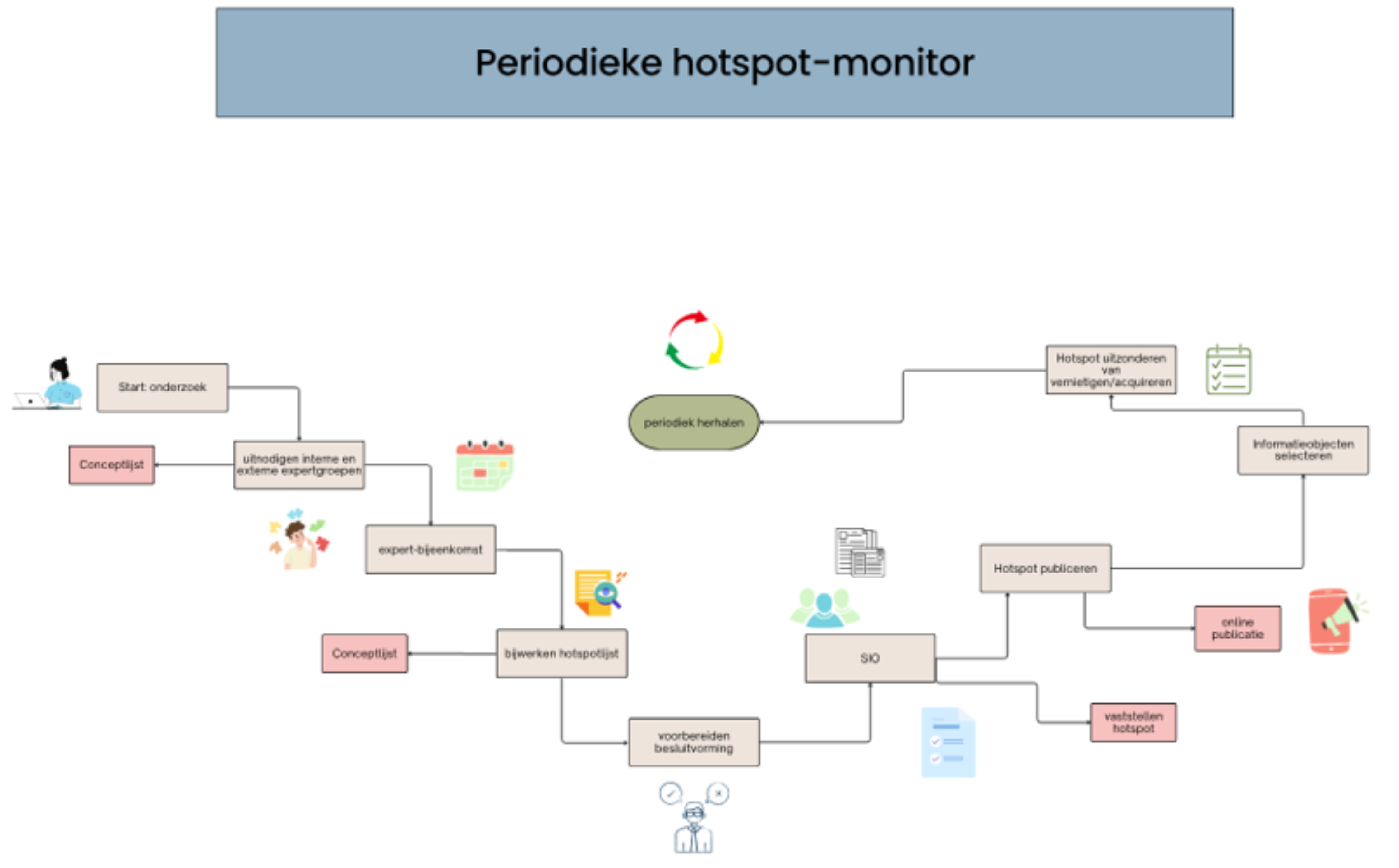 In een overleg met verschillende interne experts worden de hotspots benoemd. Deze interne experts hebben zicht op de taken van het overheidsorgaan en/of weten wat er leeft en speelt in de lokale samenleving. De adviseur digitale informatievoorziening nodigt de interne experts uit voor het overleg. Voorafgaand aan het overleg, wordt aan de interne experts gevraagd om ter voorbereiding onderzoek te doen naar mogelijke hotspots van het afgelopen jaar en deze aan te leveren bij de adviseur digitale informatievoorziening. Aan de hand van het ‘Sjabloon Hotspotlijst’ (bijlage 1) wordt een eerste conceptversie van de hotspotlijst opgesteld.