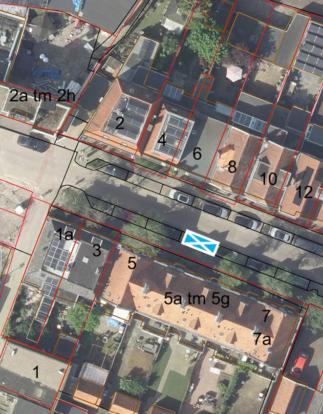 De gehandicaptenparkeerplaats wordt gemarkeerd door middel van een rolstoeltegel, witte klinkers en verwijdering van de blauwe zone streep op de stoep ten hoogte van vermeld parkeervak zoals hieronder zichtbaar in de situatieschets.
