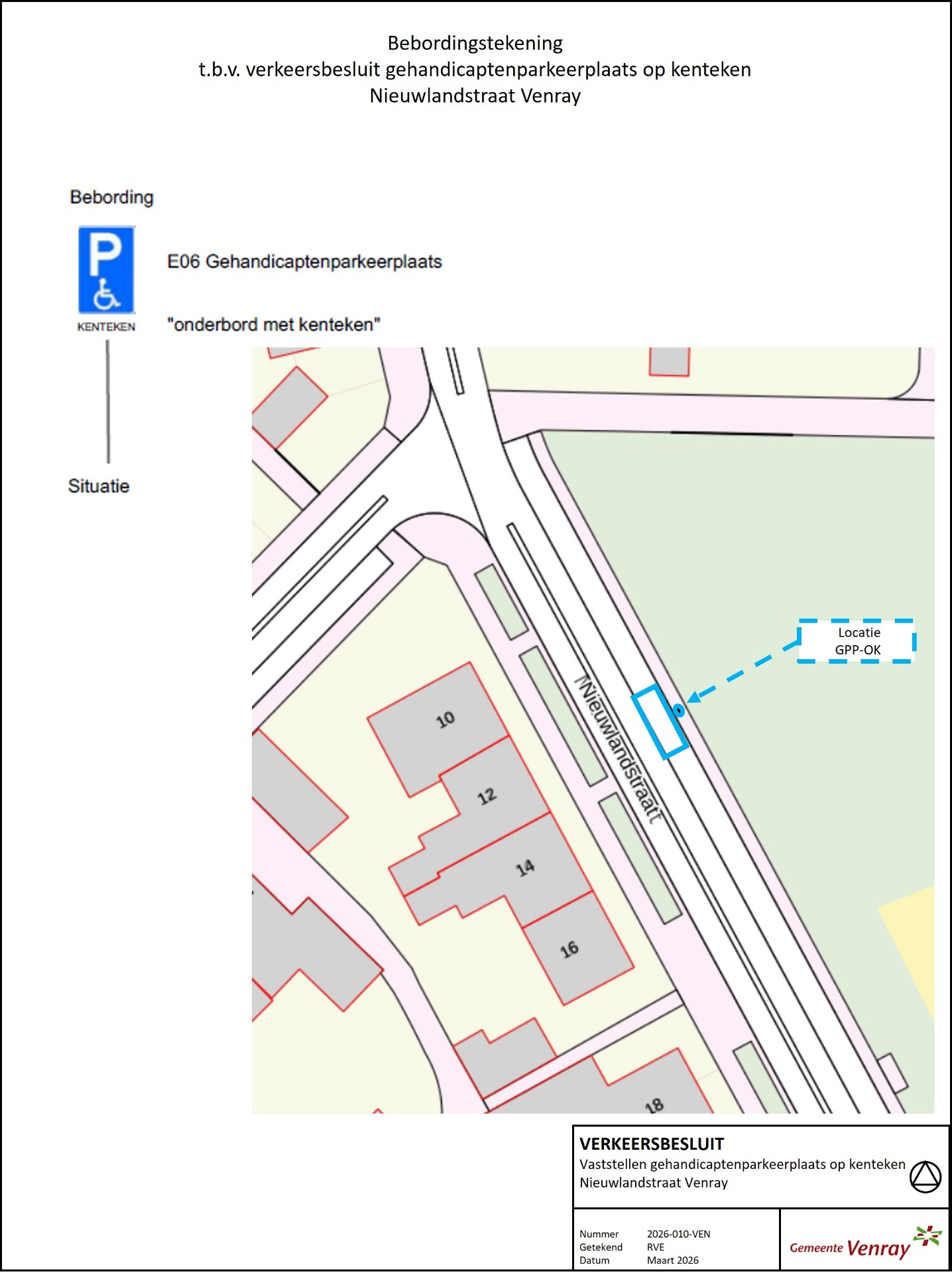 Verkeersbesluit – Vaststellen gehandicaptenparkeerplaats op kenteken – Nieuwlandstraat - Venray