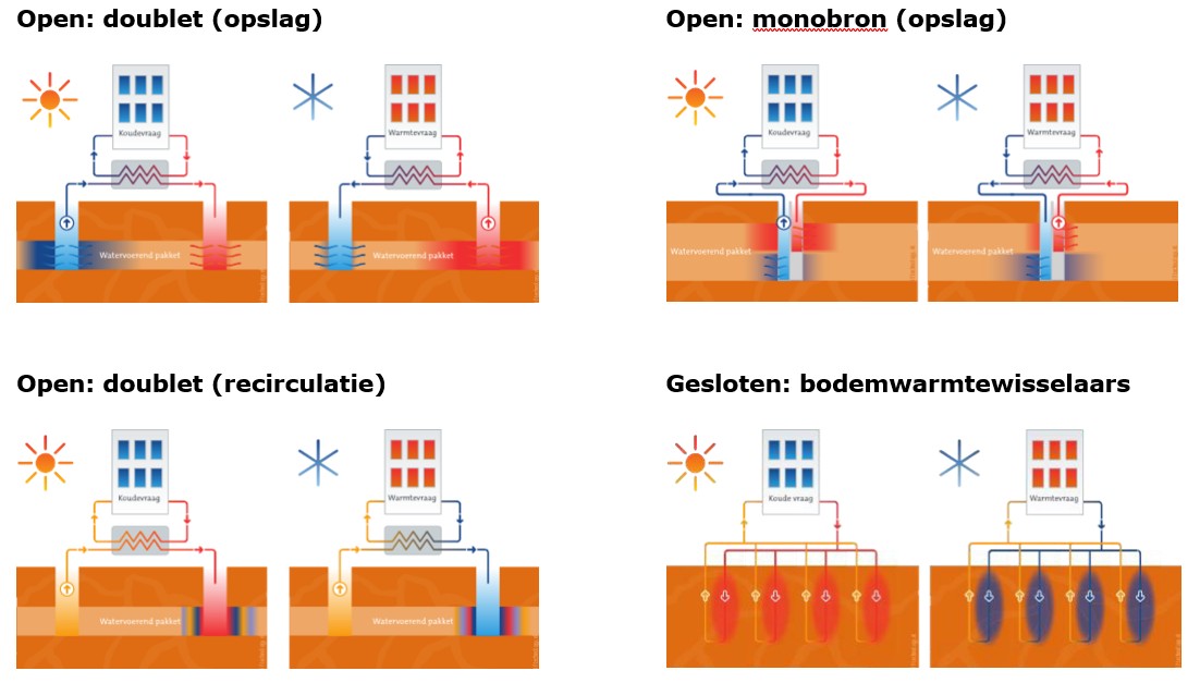 Bodemenergiesystemen maken gebruik van de bodem om warmte en/of koude op te slaan in het aanwezig grondwater. Deze warmte en/of koude wordt gebruikt voor de klimatisering van gebouwen of processen. Hiermee worden aanzienlijke energiebesparingen ten opzichte van conventionele verwarmings- en koelinstallaties gerealiseerd. Onderstaand figuur presenteert de verschillende typen bodemenergiesystemen.
