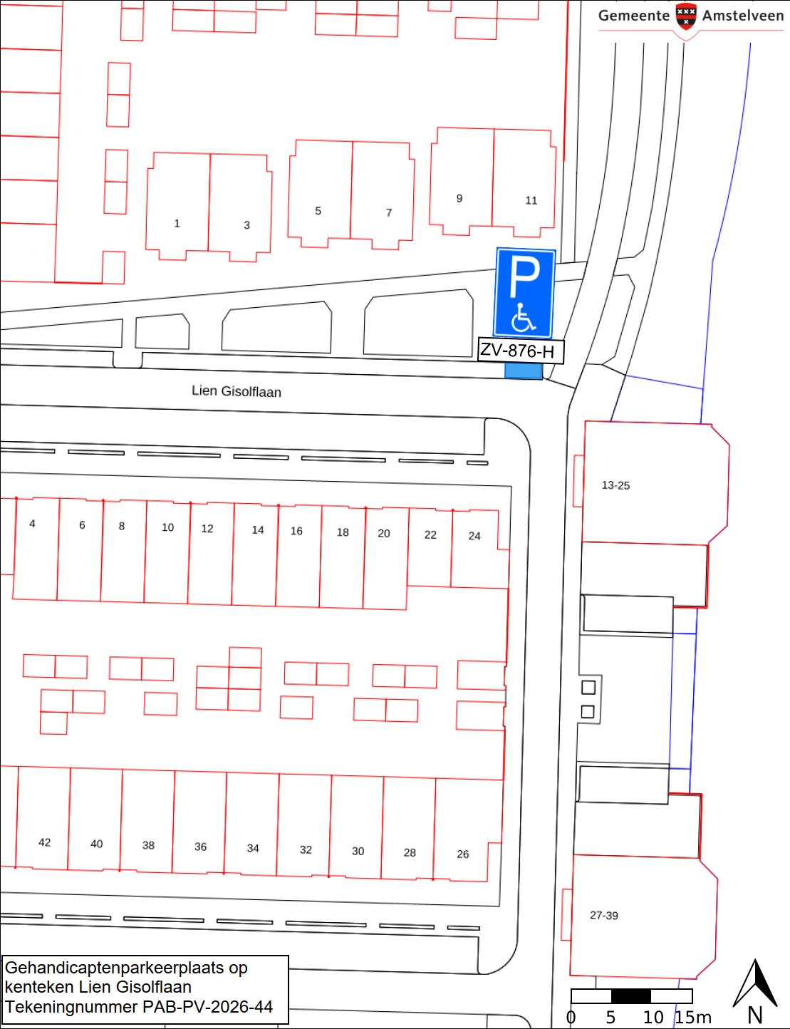 Burgemeester en wethouders van Amstelveen besluiten het parkeren te verbieden op een parkeerplaats in de Lien Gisolflaan, zoals aangegeven op tekening PAB-PV-2026-44, met uitzondering van het voertuig met het kenteken ZV-876-H (gehandicaptenparkeerplaats).