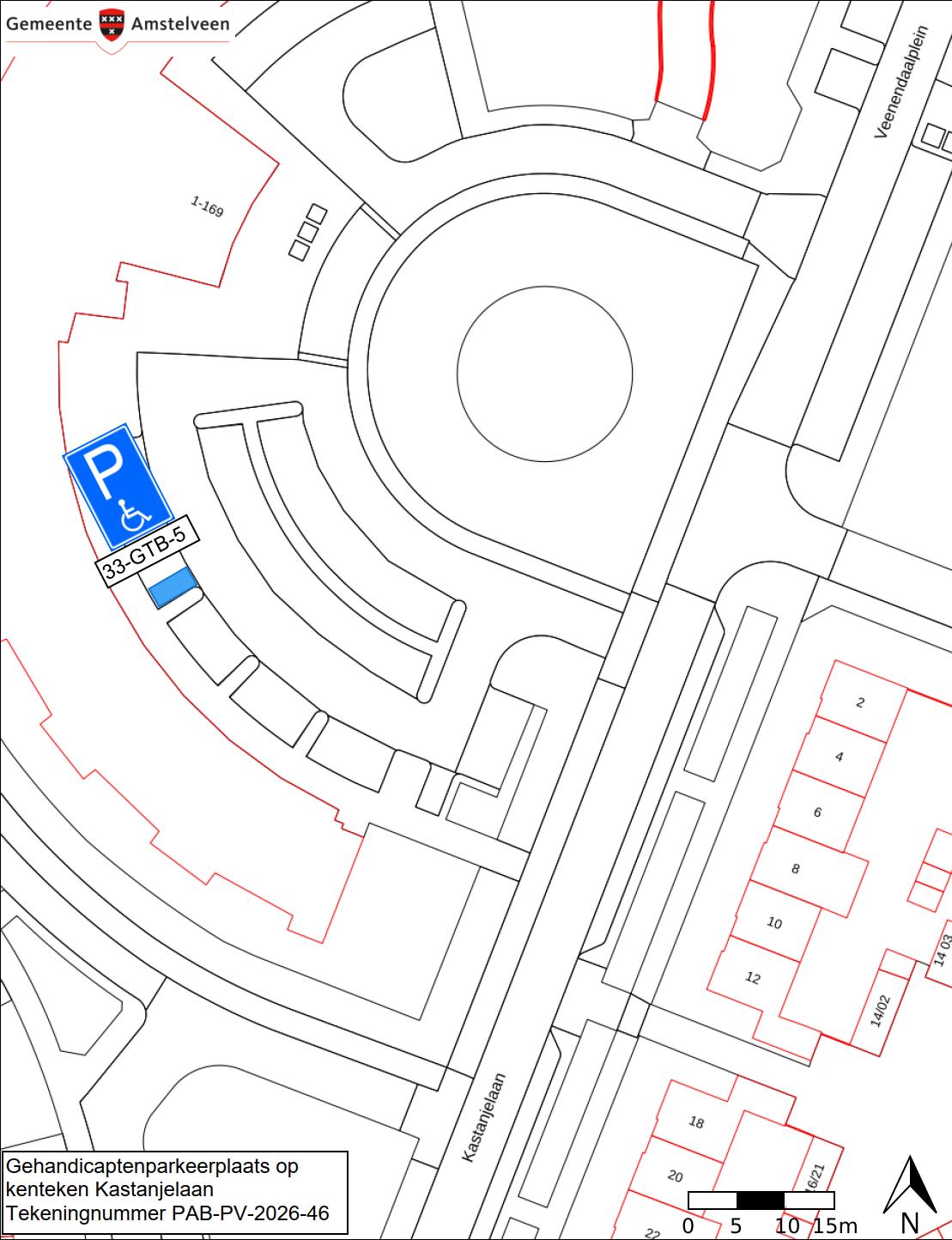 Burgemeester en wethouders van Amstelveen besluiten het parkeren te verbieden op een parkeerplaats in de Kastanjelaan, zoals aangegeven op tekening PAB-PV-2026-46, met uitzondering van het voertuig met het kenteken 33-GTB-5 (gehandicaptenparkeerplaats).