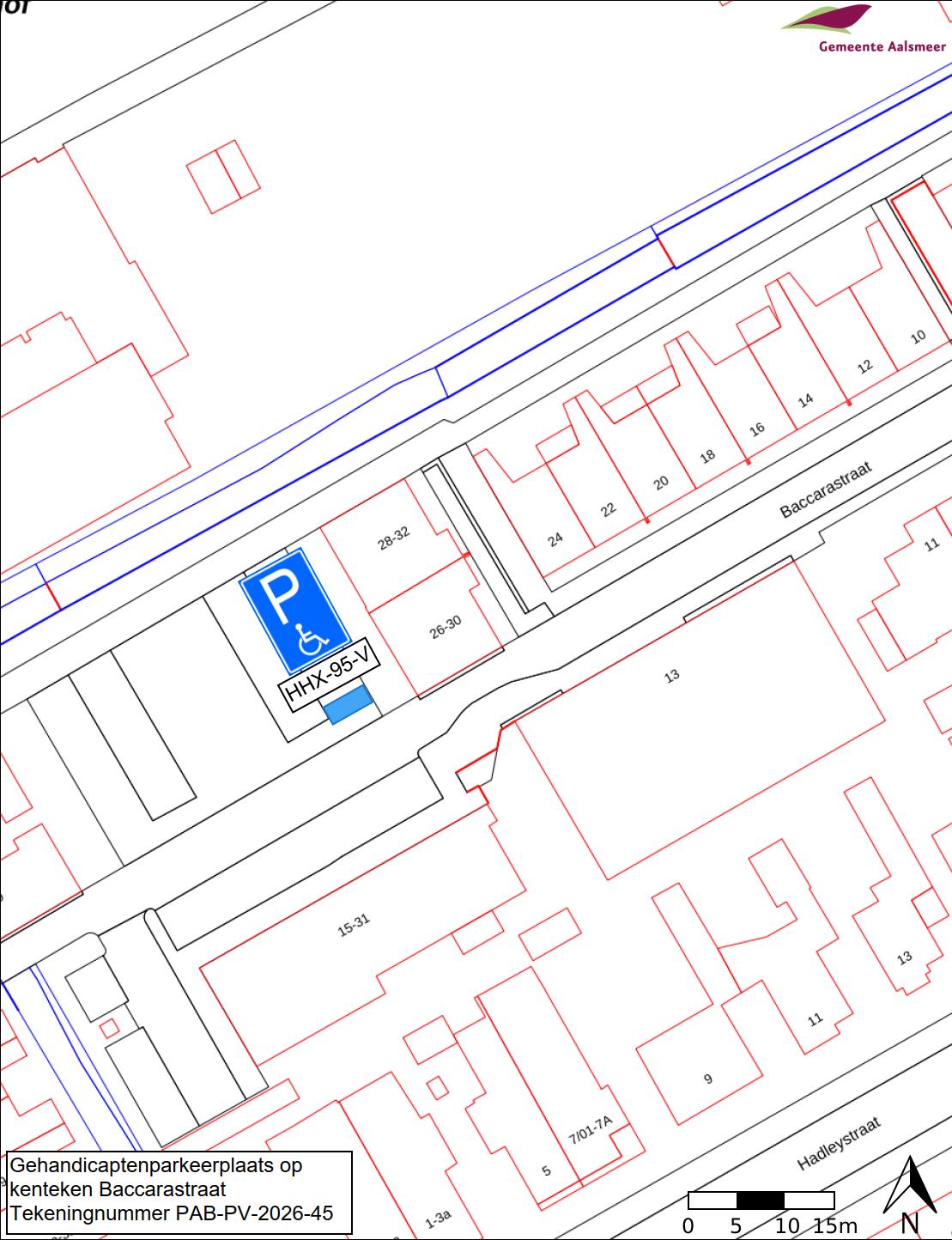 Burgemeester en wethouders van Aalsmeer besluiten het parkeren te verbieden op een parkeerplaats in de Baccarastraat, zoals aangegeven op tekening PAB-PV-2026-45, met uitzondering van het voertuig met het kenteken HHX-95-V (gehandicaptenparkeerplaats).