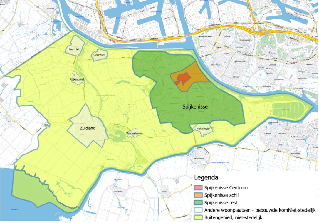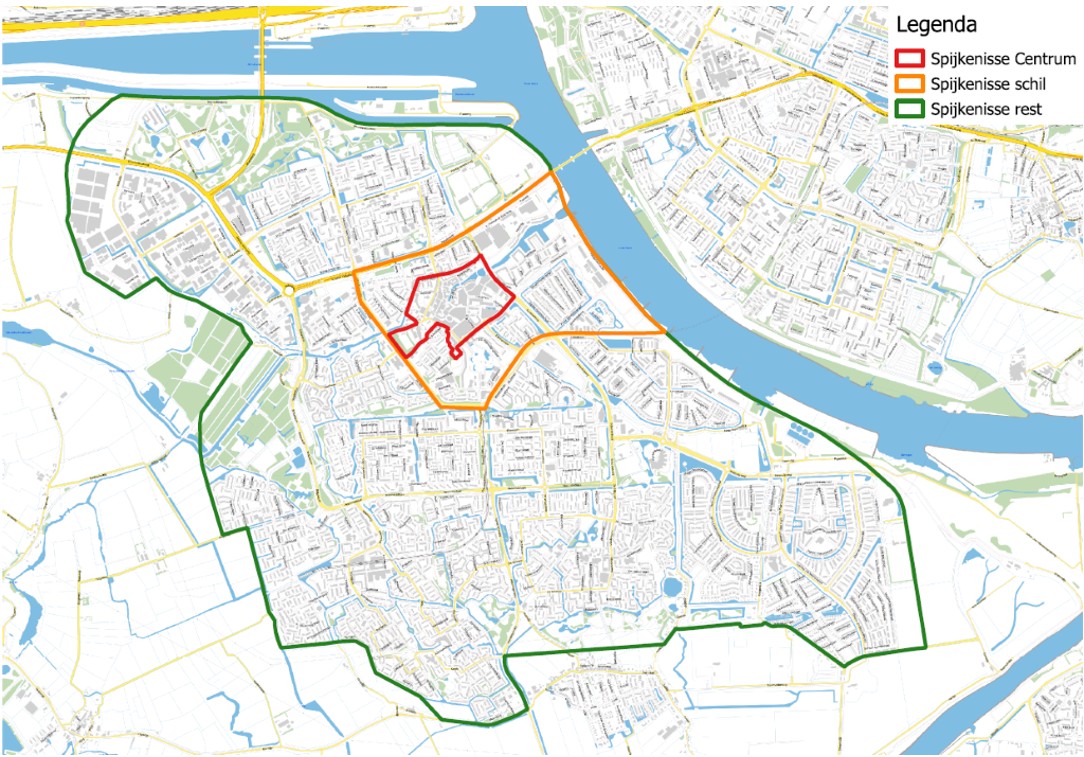 De toepassing van deze criteria is weergegeven op de kaart van de gemeente Nissewaard. De kaart van Spijkenisse is hieraan toegevoegd, om de grens van het centrum en de schil eromheen goed weer te kunnen geven.