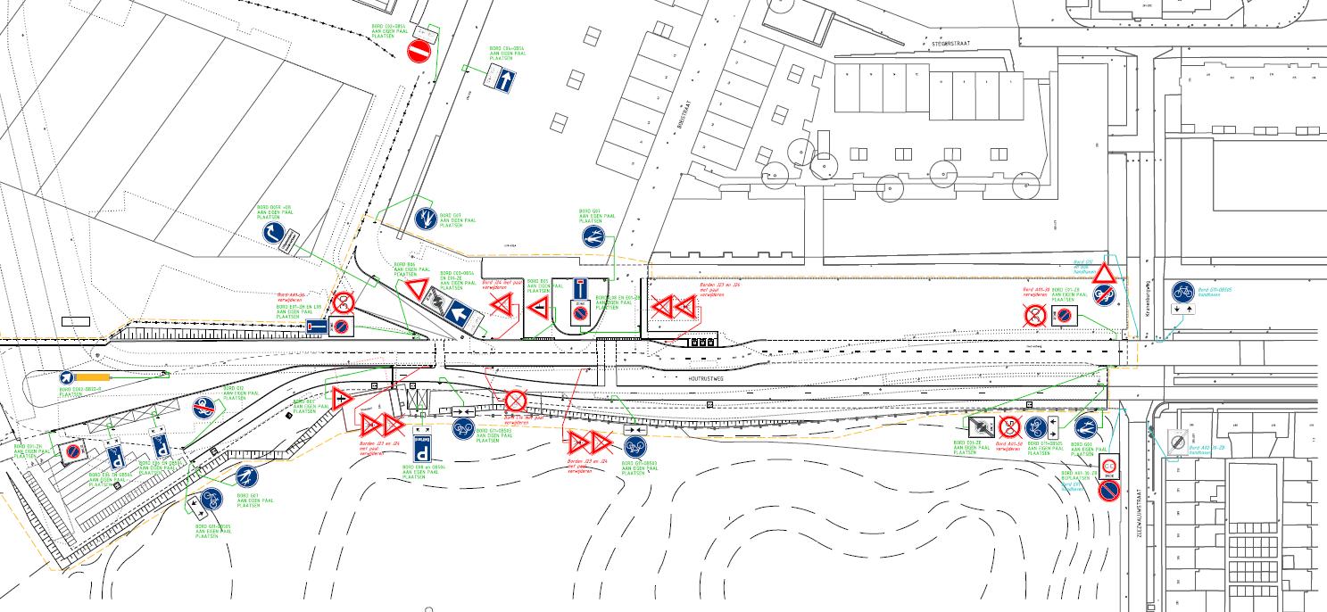 Om het bouwverkeer te attenderen op het eenrichtingsverkeer wordt het bord C02 ook geplaatst in de bocht op de Hellingkade tegenover de uitrit van het bouwterrein.