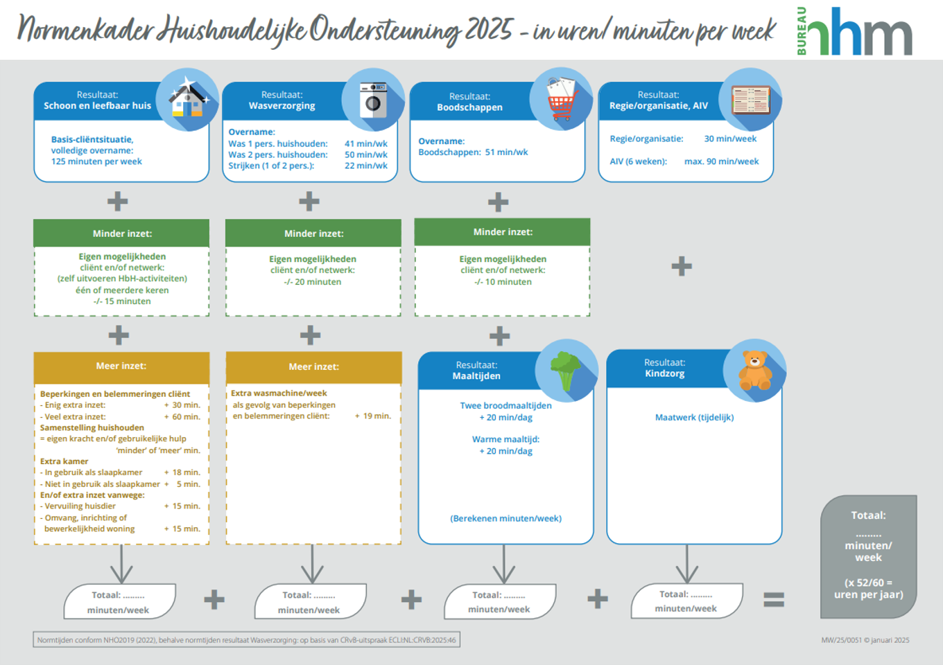In het normenkader van bureau HHM wordt per onderdeel de frequentie en/of de benodigde tijd genoemd dat toegekend kan worden. Iedere individuele situatie wordt separaat onderzocht en als die situatie erom vraagt dan wordt van onderstaande richtlijn afgeweken. De gemeente kan afwijken met zowel op- als neerwaartse bijstellingen. Dit kan alleen als gemotiveerd aangegeven wordt waarom de verhoging of verlaging noodzakelijk is. Voor alles geldt dat als maatwerk vraagt om hiervan af te wijken, dit voorgaat op de richtlijn.