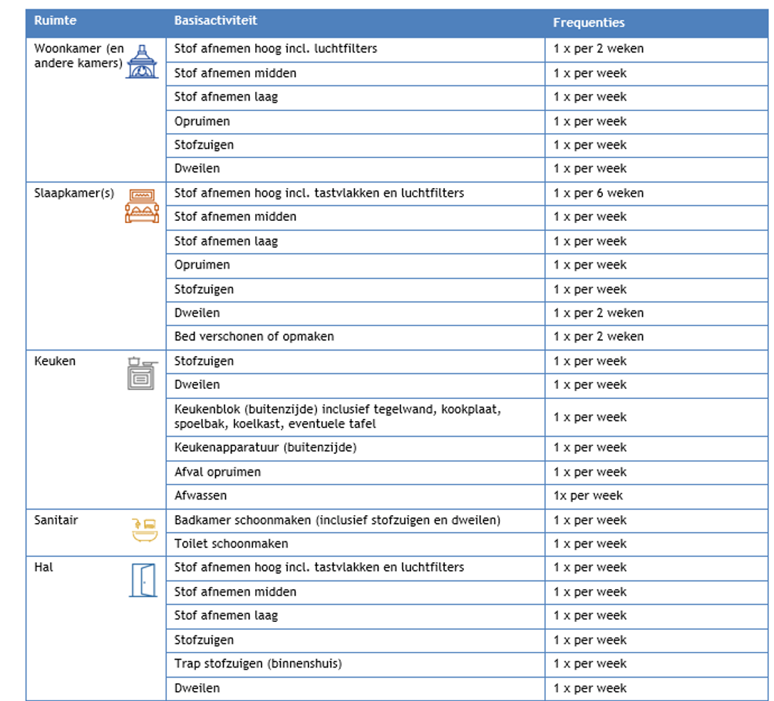 Frequenties benodigd voor een schoon en leefbaar huis (basisactiviteiten)