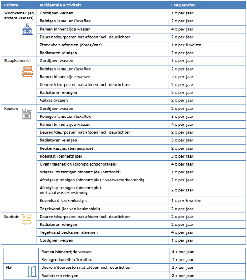 Frequentie benodigd voor een schoon en leefbaar huis incidentele activiteiten