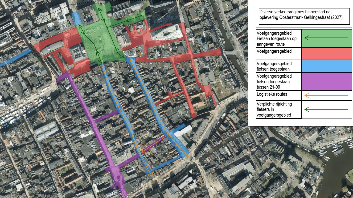 Door het instellen van een voetgangerszone aan de hand van deze herinrichtingen kan er meer flexibiliteit worden geboden in het gebruik binnen het straatprofiel. Immers, het asfalt wordt vervangen door de gele steen waarmee de hoogteverschillen verdwijnen. Hierdoor zal er geen sprake meer zijn van een eenduidige rijloper. Daardoor kunnen we de fietser, gemengd met de voetganger, blijven toestaan binnen de nieuwe voetgangerszone van de Ooster- en de Gelkingestraat. We breiden bovendien de gebruiksmogelijkheden voor de fietser uit door het toestaan van tweerichtingsverkeer voor de fietser. Binnen het ontwerp is sterk rekening gehouden met de obstakelvrije breedtes die binnen het profiel aanwezig zijn. Dit om voldoende ruimte aan de voetganger te bieden in een gebied waar fietsers in twee richtingen mogen rijden en waar de stadslogistiek tussen 05:00 en 12:00 uur s’ ochtends in één richting mag rijden en laden en lossen. Dit wordt in de nieuwe situatie aangegeven middels onderborden en verplichte rijrichtingen met uitzondering van fietsen. In de praktijk zal hierdoor eenzelfde circulatie voor de logistiek van kracht zijn als nu het geval is. Namelijk, via de Oosterstraat het centrum ingaand en via de Gelkingestraat het centrum uitgaand.