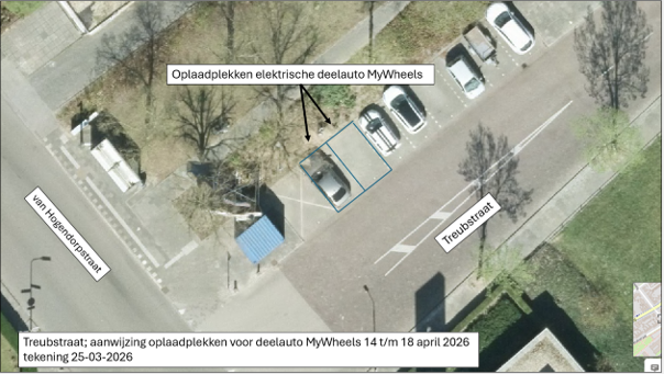 dat het voor een goed verloop van het evenement gewenst is om de deelauto’s van MyWheels van 14 tot en met 18 april 2026 een plek te geven bij de oplaadpaal in de Treubstraat;