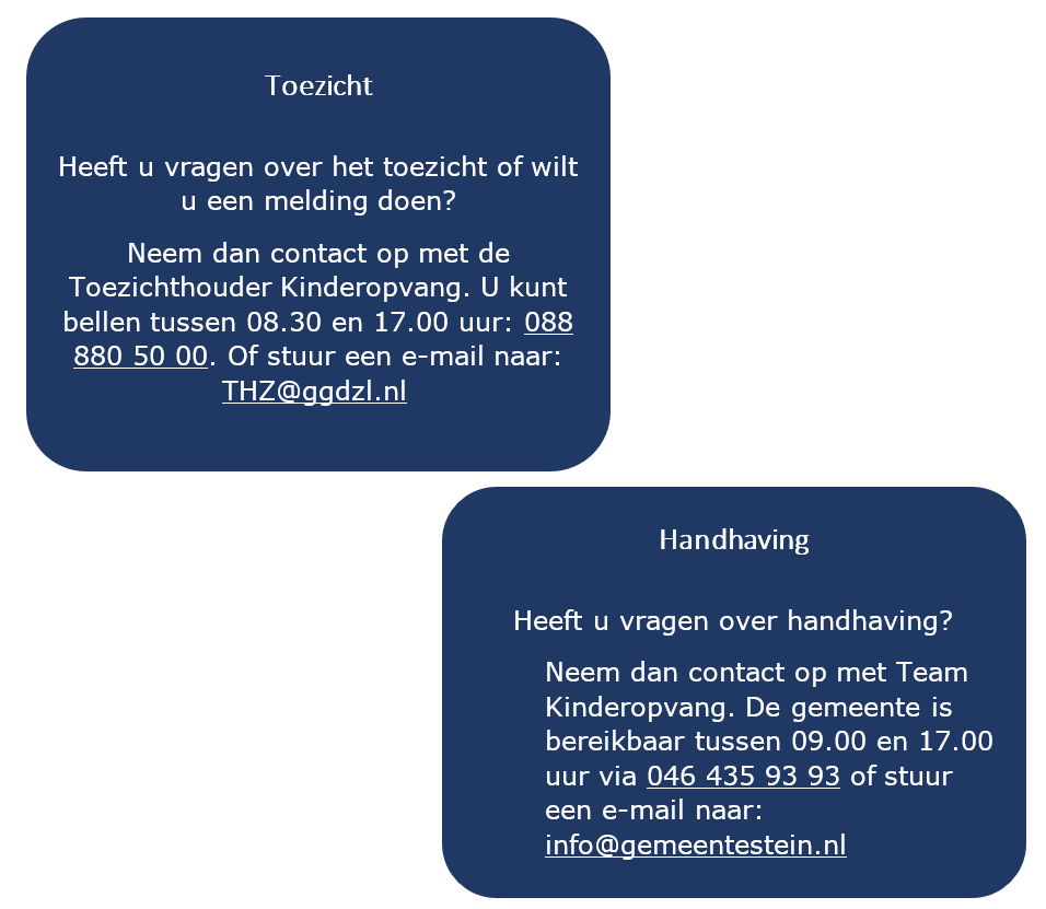 Het college vindt veilige en verantwoorde kinderopvang van groot belang. Met toezicht hierop door de GGD geeft gemeente Stein hier invulling aan. Echter, er kunnen ook signalen en situaties zijn die de toezichthouder in het toezicht niet direct constateert, maar ouders, beroepskrachten en andere betrokkenen wel. Zowel het college als de toezichthouder roepen iedereen die een zorg, melding of signaal heeft over de kinderopvang op deze met ons te delen. Dit kan bij de gemeente Stein bereikbaar via info@gemeentestein.nl. Met signaal-gestuurd-toezicht reageren reageert de toezichthouder op signalen uit de samenleving. Meldingen en klachten over incidenten, misstanden en terugkerende tekortkomingen zijn voor het toezicht een belangrijke bron van informatie. Ze kunnen een signaal zijn dat ergens sprake is van onveilige of kwalitatief niet goede kinderopvang.