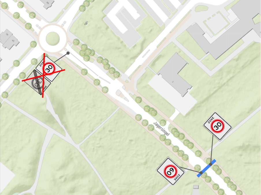De maximumsnelheid van 30 km/u op de Jagersingel wordt ingesteld tussen de komgrens en de rotonde met de Lindenlaan/Prof. Lorentzlaan door middel van het verwijderen van de bestaande begin/einde zoneborden A1-30 van bijlage 1 van het RVV 1990. Deze begrenzing van die 30-km zone wordt verplaatst naar de komgrens door het plaatsen van het begin zonebord A1-30 van bijlage 1 van het RVV 1990.