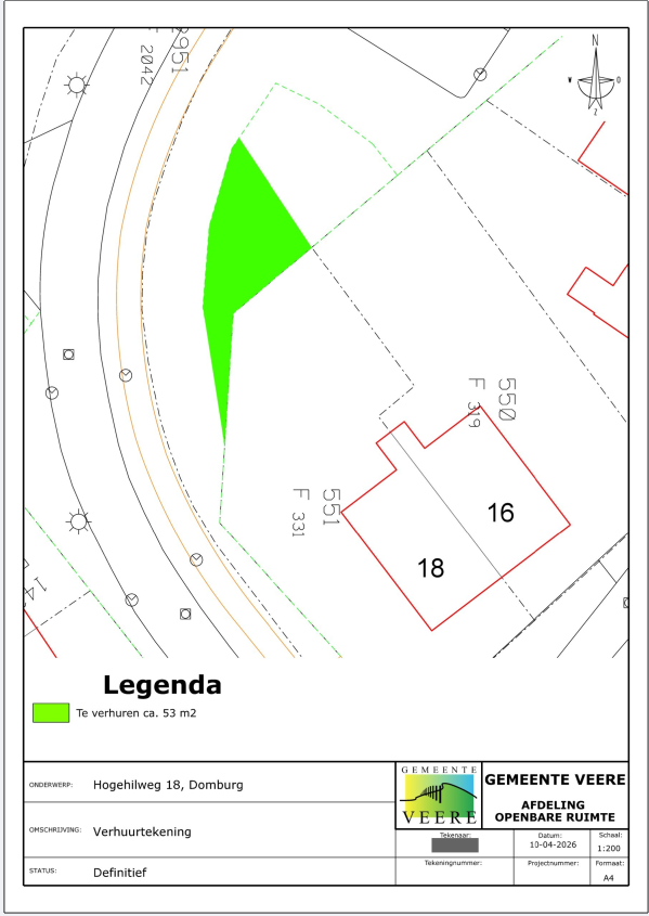 De gemeente Veere heeft het voornemen om de groenstrook van het perceel, gelegen bij en grenzend aan Hogehilweg 18 te Domburg, kadastraal bekend gemeente Domburg, sectie F nummer 2971 te verhuren aan de aangrenzende perceelseigenaar. De te verhuren groenstrook is in het groen weergegeven op onderstaande verhuurtekening.