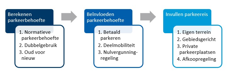 Vervolgens kan de parkeerbehoefte per functie nog beïnvloed worden, bij woningen bijvoorbeeld door de inzet van deelmobiliteit. Dat geeft dan een reductie op de parkeerbehoefte van die functie.