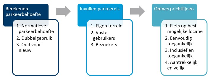 Voor het ontwerp van fietsparkeervoorzieningen gelden de volgende basisontwerpprincipes: