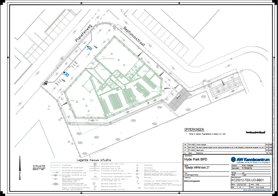 Vervolgens is de openbare ruimte gewijzigd waarbij het gebouw ‘Kensington’ is opgeleverd, maar waarbij de openbare ruimte nog niet de definitieve inrichting heeft waarbij het gebouw ‘Notting Hill’ volop in aanbouw is. Voor deze tijdelijke inrichting van de openbare ruimte is wederom een verkeersbesluit genomen met betrekking tot onder meer laad- en losplaatsen en gehandicapten-parkeerplaatsen. Dit verkeersbesluit is gepubliceerd op 10-11-2025 met kenmerk XS-25102910.1534.